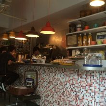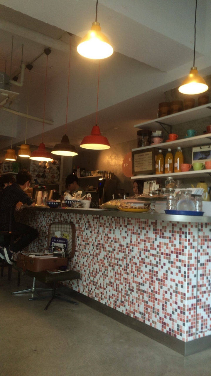 大通りに面したステキカフェ。デンマークスタイルのコーヒーをバリスタが淹れてくれる、カジュアルなキャッシュオン式です。店内はいっぱいでむりやりテラス席を確保。ゆるい雰囲気で子連れの人も安心の憩いの場です。