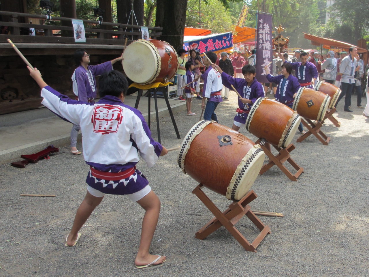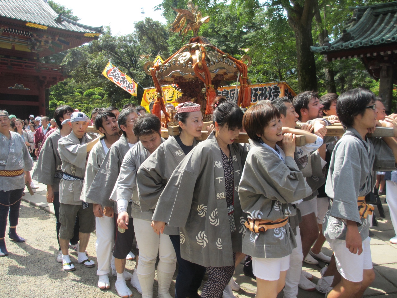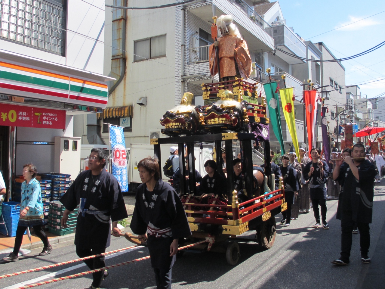 山王祭、神田祭と並ぶ江戸三大祭りの一つ、根津神社例大祭を見てきました。毎年9月中旬の土曜日、日曜日に行われます。町の中を、正装を着て大きな神輿を担いだり、神輿用の袢纏を着て大きな山車を曳いたりして神社に向かいます。馬や人力車も参加します。神社では太鼓に合わせ、舞が演じられます。境内にはたくさんの屋台が出て祭りを盛り上げます。沿道には祭りを見る人たちでにぎわいます。見学する場合はコースと時間を確認ください。