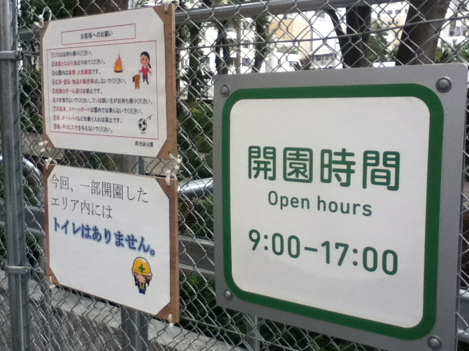 JR池袋駅の南東、ラーメン店等が並ぶ路地の1本東側にある公園。平成26年度末まで建設工事のため閉鎖されていたが、久しぶりに来てみたらこの4月から北側の一部が開園されていた。工事のフェンスには、動物や花の絵、納豆売りの話のプレートなどが貼られている。一方、一部開放されて部分はコンクリートの低い塀があり、やや高い木々が所々に立っている程度で殺風景な感じもある。ただ、一部とはいえ休憩等で利用できるので、訪問することをお勧めする。