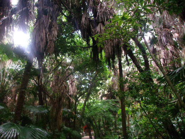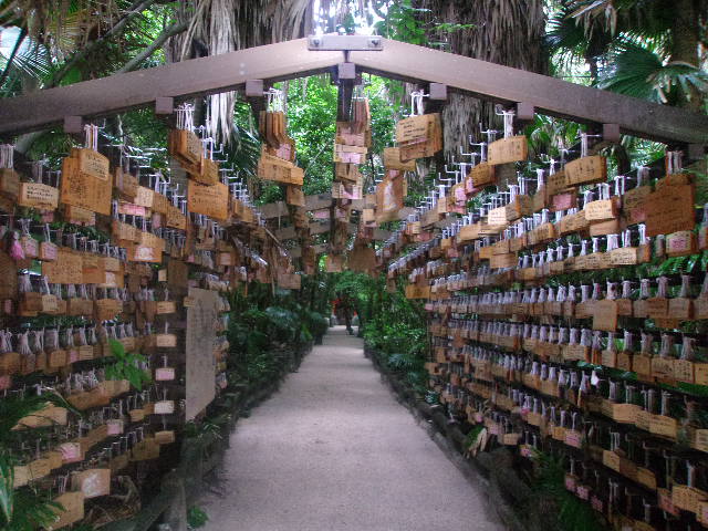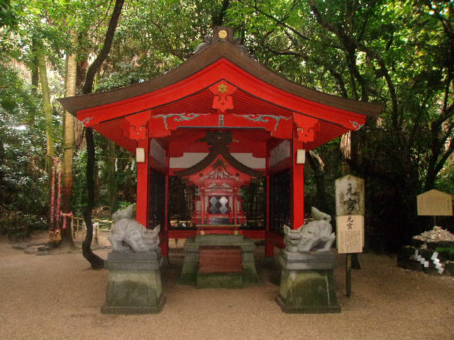 青島はかつては一般人が立入禁止の神聖な場所であったそうですが、現在の青島神社の本殿付近はメジャーな観光地としての風情に満ちていて、多くの観光客が本殿を見てそのまま折り返して戻っていくようでしたが、その敬虔な雰囲気を味わうためには、是非、現在の本殿の手前、向かって右手に続く元宮への細道を歩いてみて下さい。まず願掛けの絵馬で両側を埋め尽くされた箇所を抜けると、島内の鬱蒼とした森の雰囲気が突然広がり、その奥にひっそりと小さな祠の元宮が佇んでいます。この辺りの雰囲気は最高に素敵で、現在の観光地青島としての”チャラチャラ”とした雰囲気が苦手、という方には特にお勧めです。