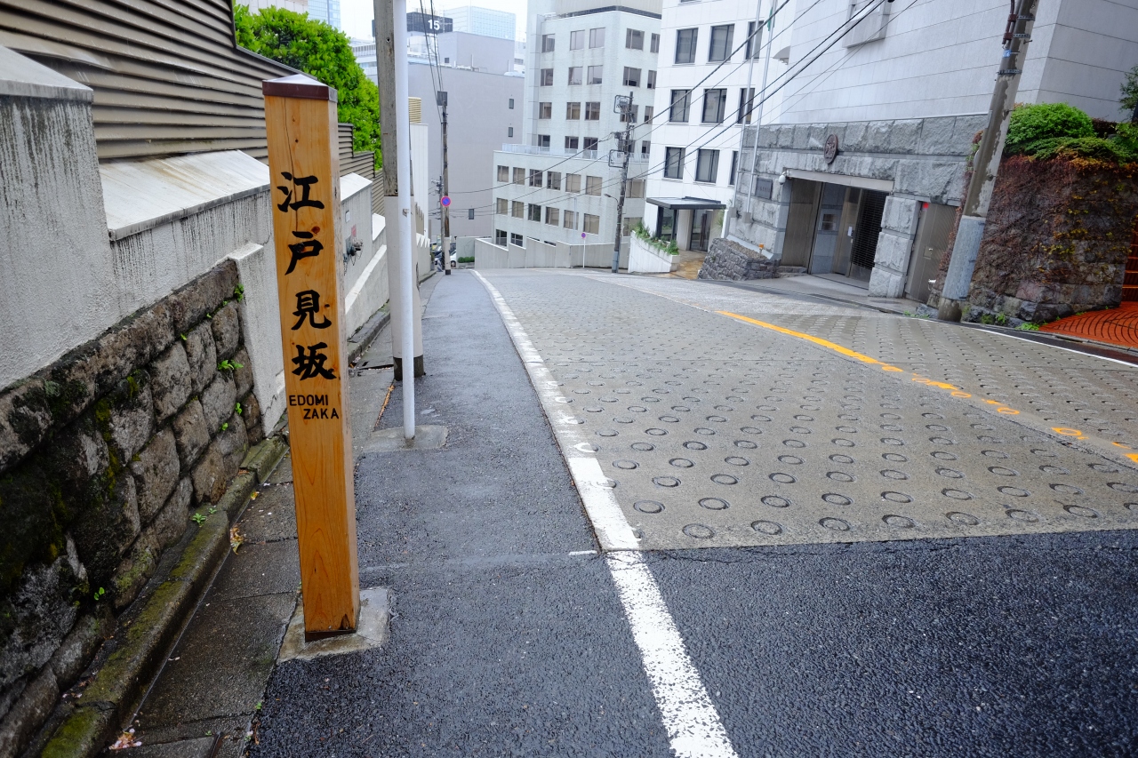 けっこうきつい坂です。文字通り、ここからは江戸の町がよく見えたのでしょうね。東京の坂には坂の名前と由来を記した柱が建ててあり、坂巡りも楽しいですが、なんせ、上り下りがけっこうきびしいので、体力的にはなかなかたいへんです。