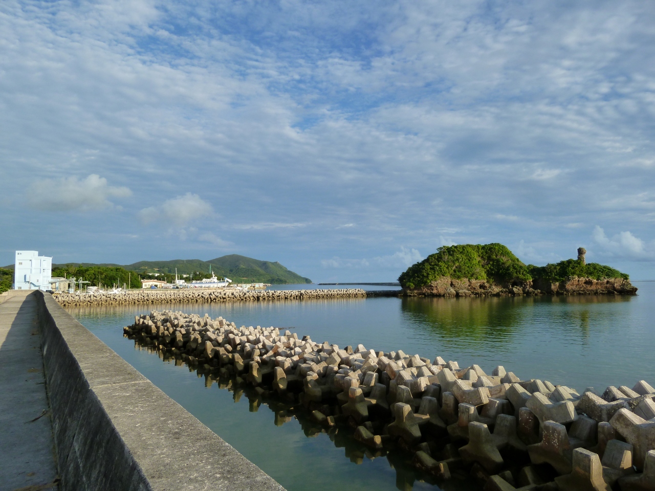 この島の反対側はフェリーターミナルになっているのでそちらからも見れますが兼城港側には大きな公園が漁港に面して造成されているのでそこから見た方が綺麗に見えます。