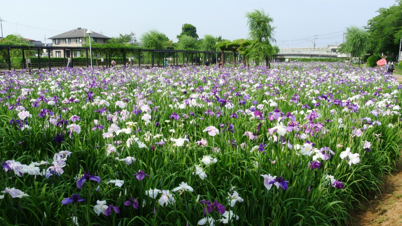 園内は100万株のあやめが植えられているとのことで、園を跨ぐ橋の上から眺めて見ることにした所、園は細長く周りの住宅がすぐ横にあるため景観が損なわれてしまいました。