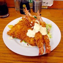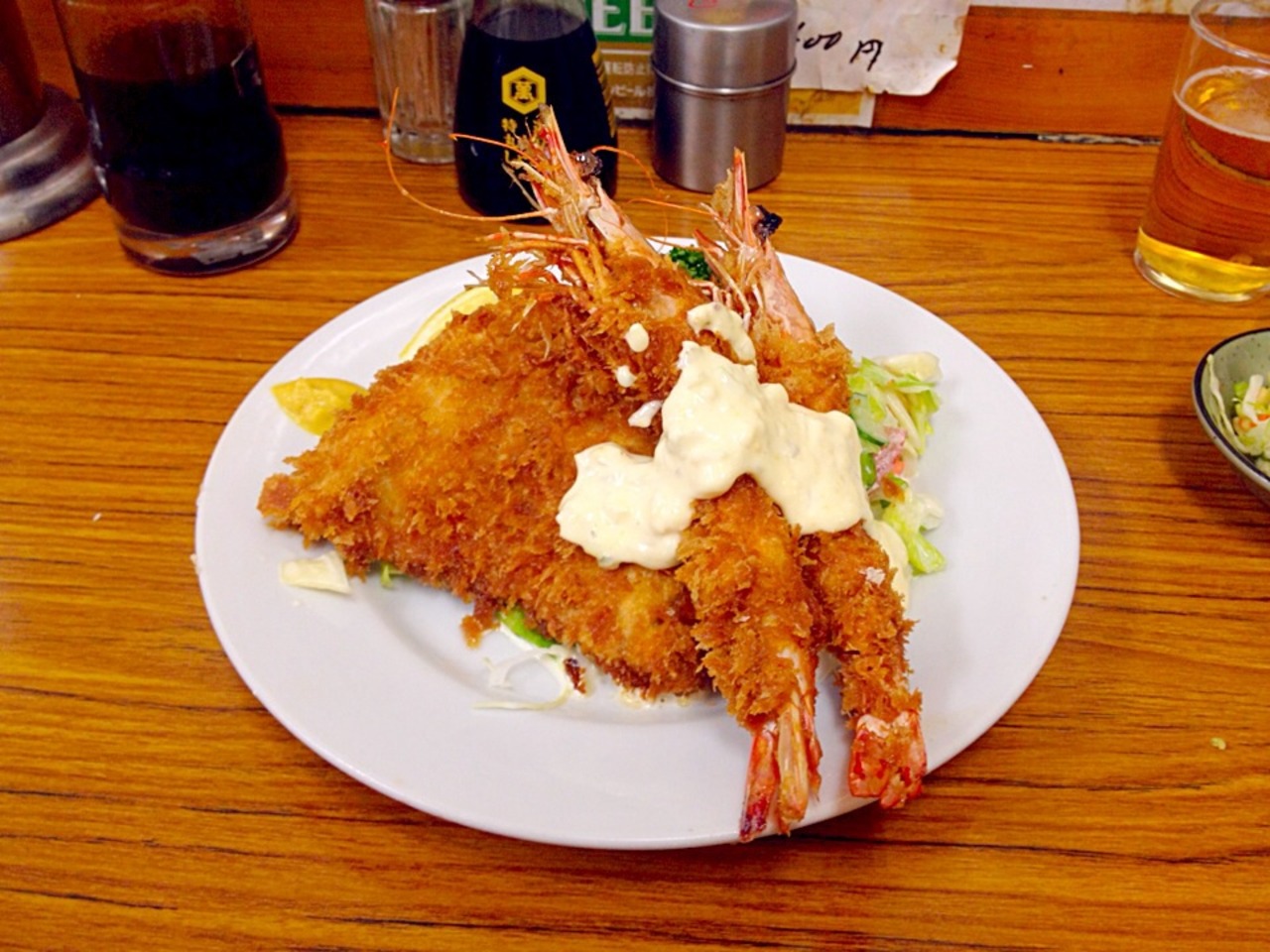 アジフライ定食1300円のつもりが、車海老も食べたくなり、アジフライ・エビフライ定食1500円(たしかそんな感じのお値段)に変更。