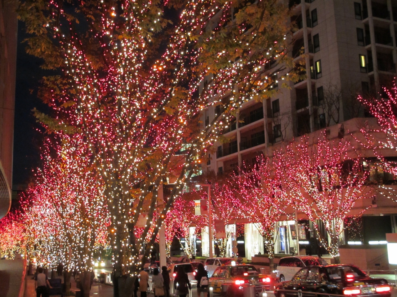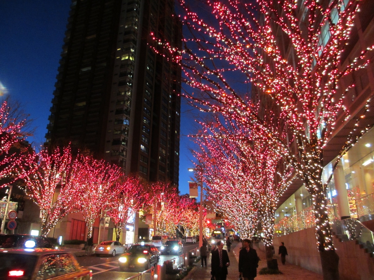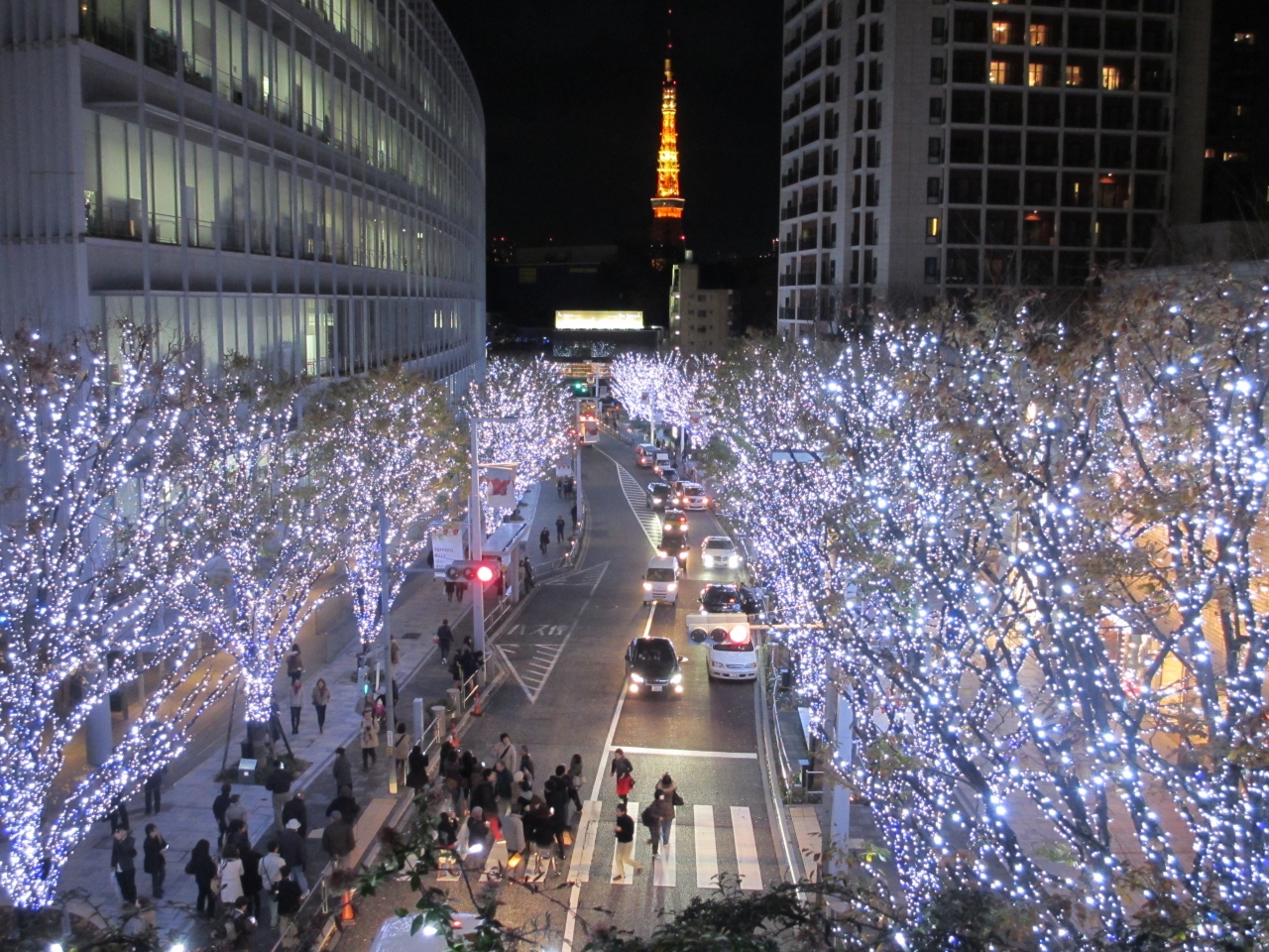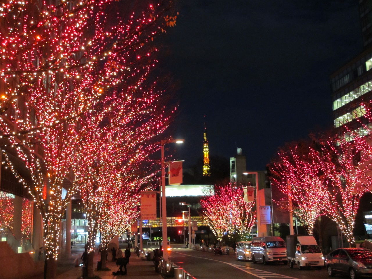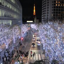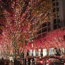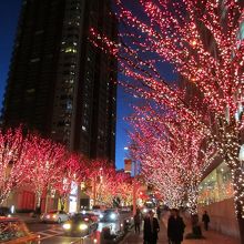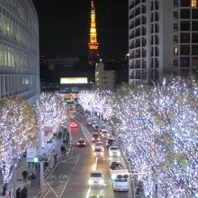 六本木けやき坂はクリスマスシーズンになると沿道の両側の木々全体が白と青のLED電球によってきれいにライトアップされます。さらに午後5時からは1時間ごとに赤い電球に変わりライトアップされます。また坂の途中にある歩道橋からはライトアップされた東京タワーを見ることができます。けやき坂はクリスマスムード全開になります。近くにある六本木ヒルズもクリスマスツリーで飾られます。