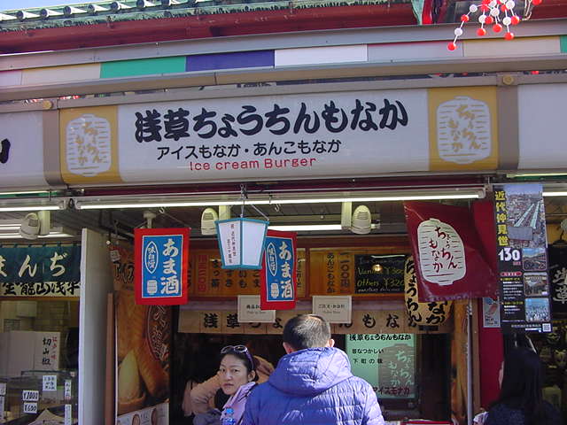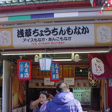 外国人観光客も多い浅草の観光スポット、「仲見世商店街」の中にある最中のお店。アイスモナカとあんこもなかを扱っていますが、アイスモナカは「アイスクリームバーガー」と紹介されていて、外国の方の需要も大きいようです。甘酒も扱っていました。