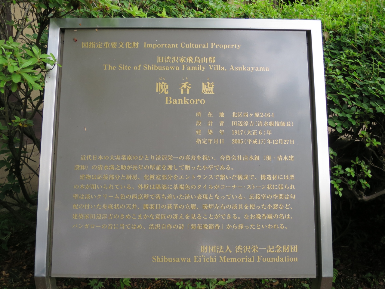 飛鳥山公園の東側一角にある旧渋沢庭園にある重要文化財にしていされている桟瓦葺きの木造平屋建ての小さな建物です。青淵文庫に行ったあとに立ち寄りましたが、緑の木々の中にあり、一瞬見過しそうになりました。大正6年に渋沢栄一の喜寿を記念して清水建設から贈呈された談話室だそうです。中は公開されていませんでしたが、小さいですが、凝った意匠が随所に施されており、お洒落な建物です。