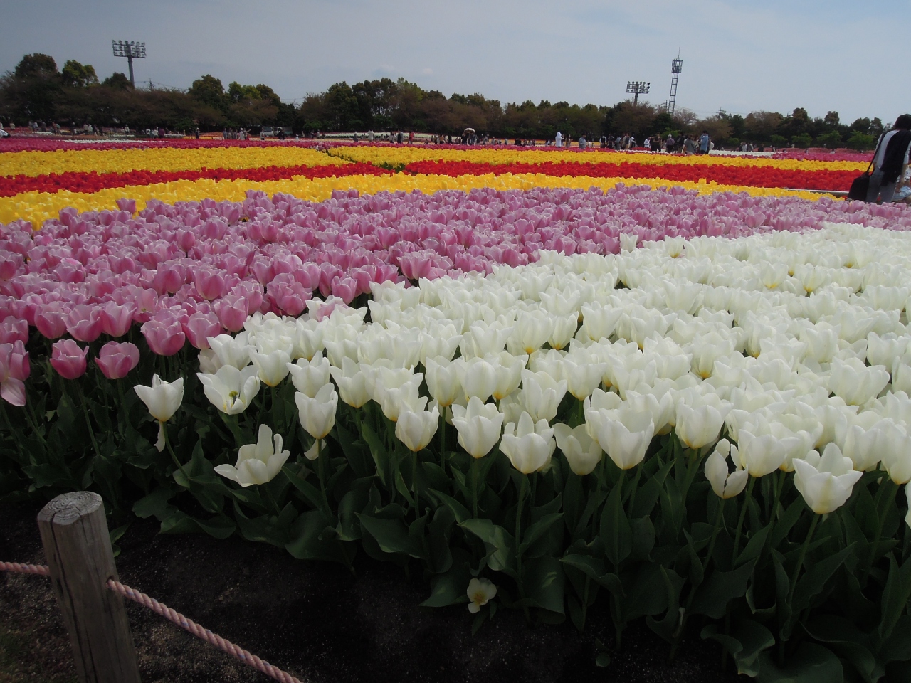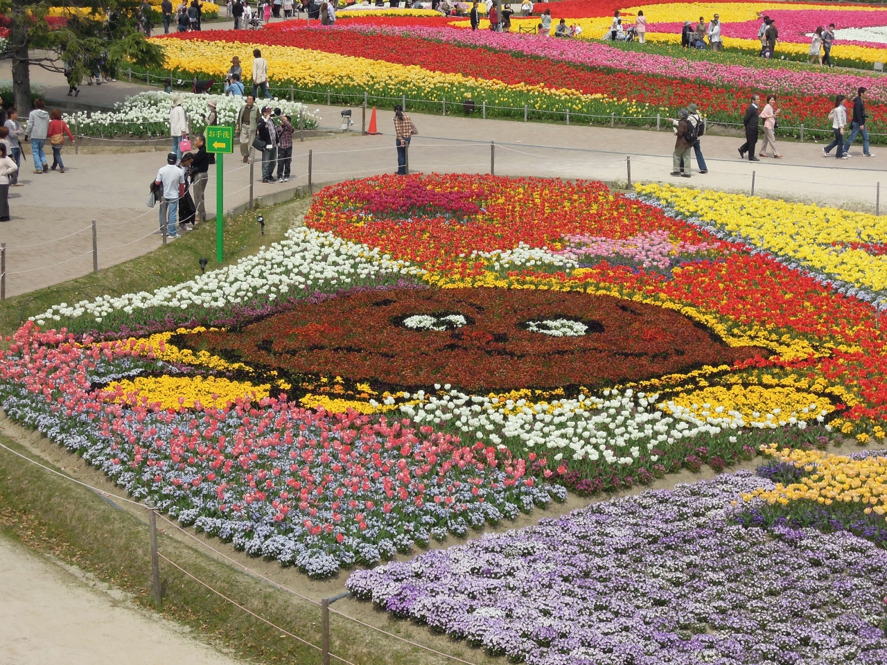 季節ごとに色とりどりの花が咲き誇り、広い園内は見応え満点です。通路も余裕があり、整備されているのでベビーカーや車いすの方でも無理なくまわれると思います。チューリップの季節に行くと、キャラクターのイラストをチューリップで見事に描いたチューリップ畑を見ることができます。展望台にあがり、少し高いところから見るととてもきれいに見えます!