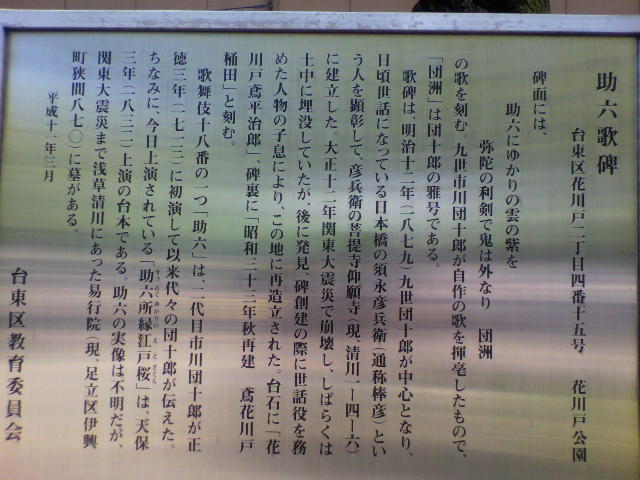 花川戸公園内に「助六の歌碑」があります。明治12年に九世の市川団十郎が中心となってお世話になっていた方を顕彰して、その方の菩提寺「迎願寺」に建立されたのですが、関東大震災の際に倒壊、しばらく土中に埋没していたそうです。