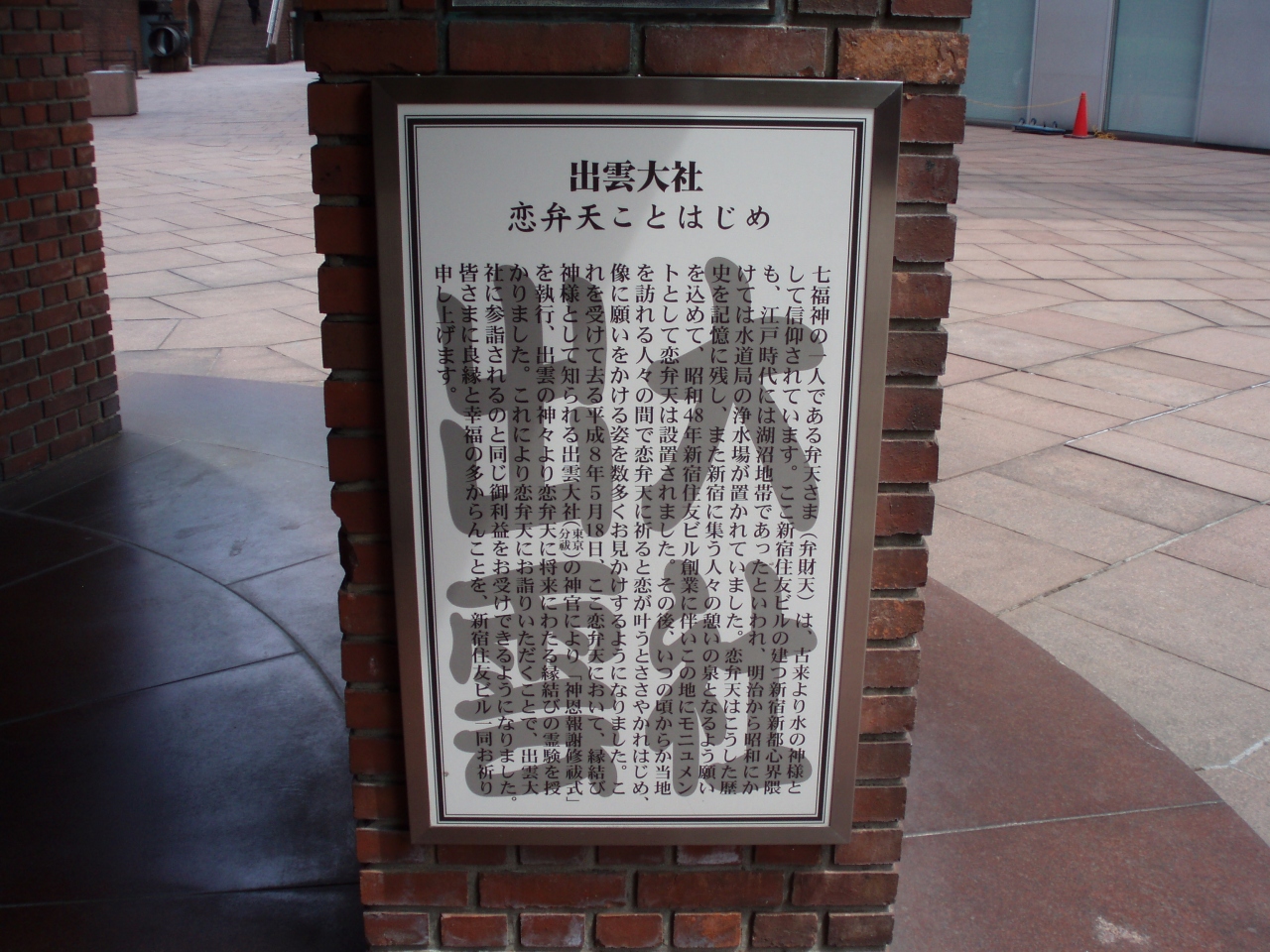 新宿西口の東京都庁近くの新宿住友三角ビルの1階敷地内に恋弁天はあります。恋弁天 は1975年にポリネシア風の弁天様のモダンなモニュメントを設置し、その後、出雲大社から縁結びの霊験を授かりお参りすると恋が成就すると言われてます。この地は東京水道発祥の地のモニュメントもあります。