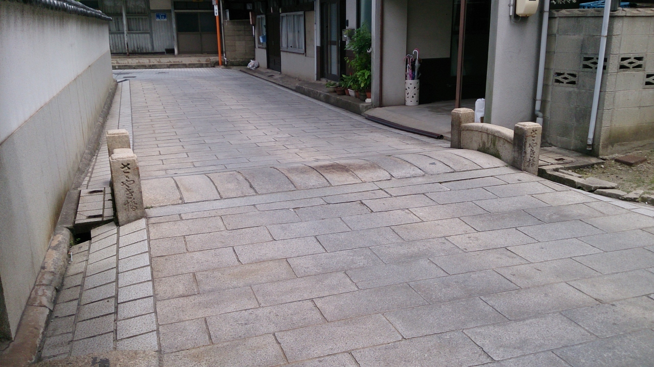福山市の鞆の街の中心部のお寺が集中してあるエリアの生活道路にある史跡で、山中鹿之助の首塚の前にありますが、地域の方の幅員4~5mぐらいの生活道路が石畳になっており、その道路がバンプのように少し盛り上がっており、その部分の道路の両端に橋の欄干の様な石製の飾りがされており、あまりの目立たなさに、気を付けないと見過ごしてしまう感じです。すぐ脇には説明板がありますが、なぜこのような形でここに設置されたのかは書いておらず不明です。ある意味で日本で最短の橋にもなりそうな史跡です。