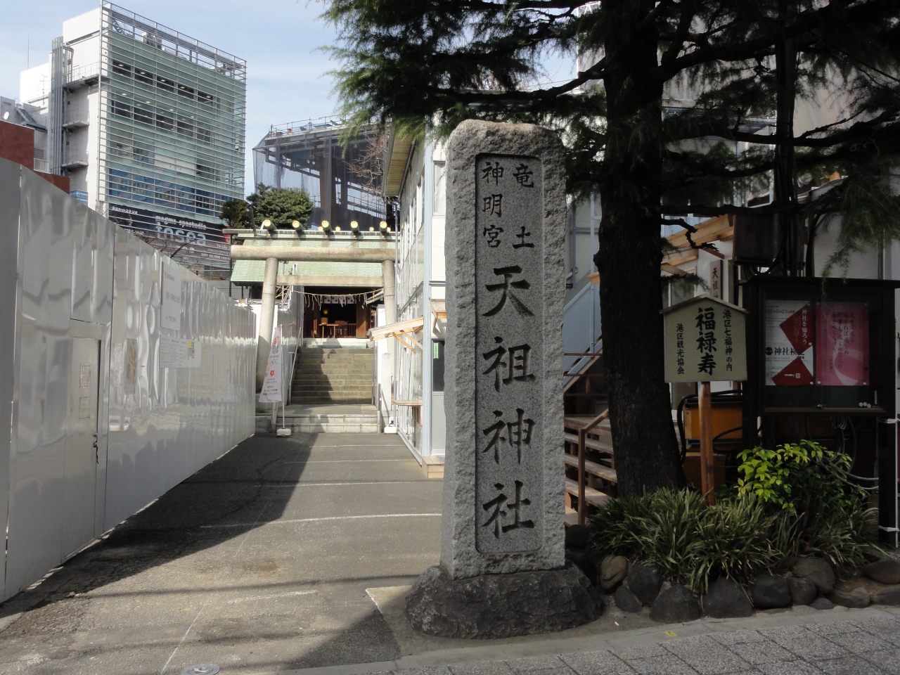 六本木天祖神社は地下鉄の六本木駅から住宅街の龍土町美術館通りを入ったところにひっそりと建っています。神社の隣では大きなビルの工事を行っており高い塀で覆われていますが、工事が完了したとき調和を取れた景観になっているか心配です。