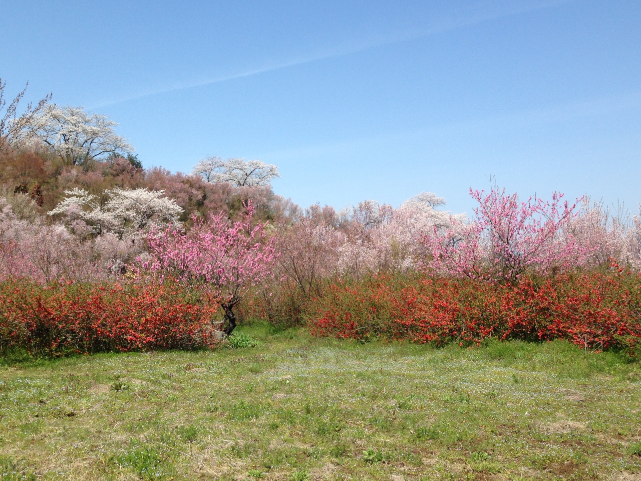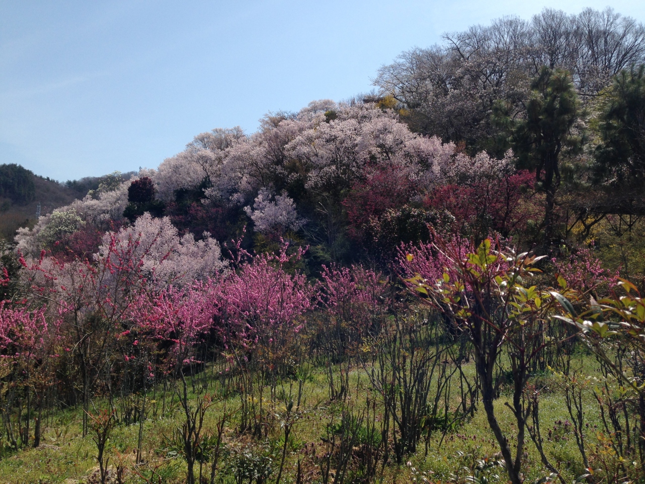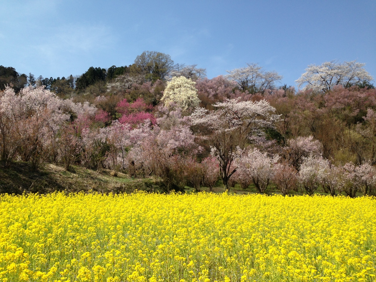 駐車場から花見山公園の入口まで、個人が所有されている里山を歩くのですが、濃淡のピンクの桜に菜の花が映りこむ場所がとにかく綺麗で感動しました。