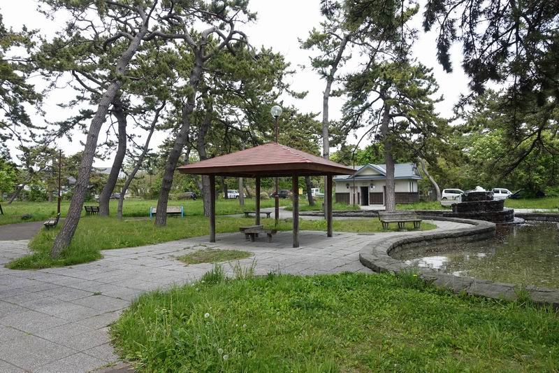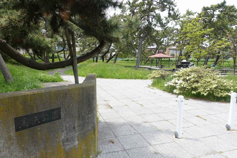 湯の川温泉の中心付近に位置していますが、大通りから奥に入った所にあり、あまり目立たない感じです。平日の日中ということもあり公園には誰もいませんでした。遊具等はなく、らせん状の噴水と東屋、ベンチがあるくらいで、特にこれといった見所はないです。