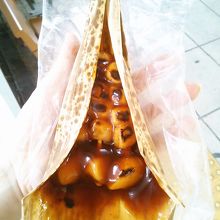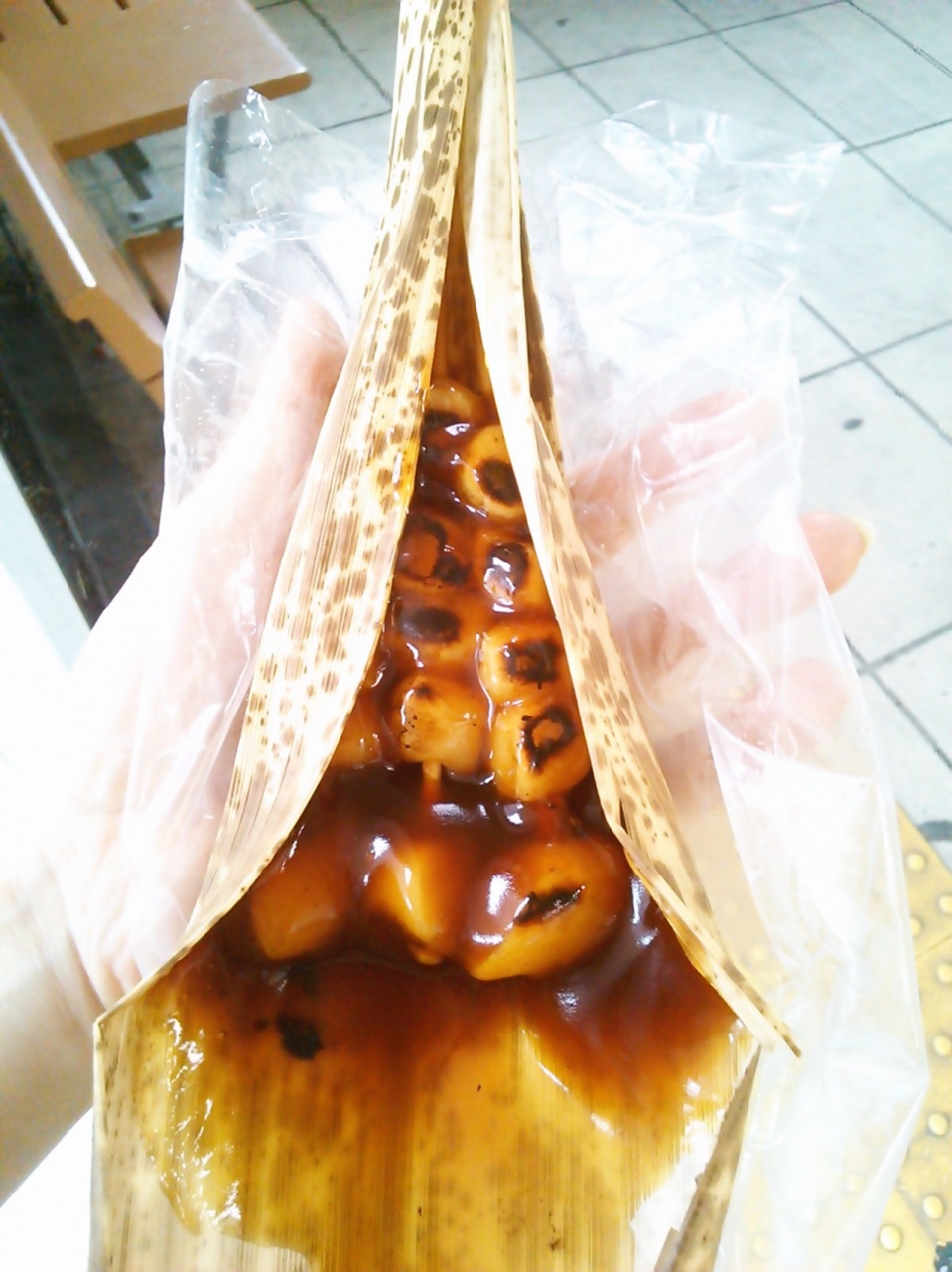 本当は一本だけ買って食べ歩きしようと思っていたのですが、何となく3本頼んだら何と本物の竹の皮に手慣れた手つきで包んで渡されました。