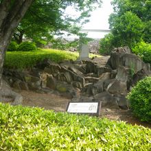 舞鶴城公園の鍛冶曲輪(自由広場)の近くにありました。ちょうど坂になっている場所で岩盤の上に石が山のように積み重なっていて、ここから石垣の石を切り出していたのがわかります。石切り場はここ以外にも数か所あったようです。
