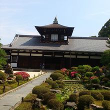東福寺の通天橋を通り、青紅葉を堪能し先に進むと屋上に楼閣がある変わった形の建物が見えてきます。開山国師像を安置しているお堂です。境内に入ると広い枯山水の庭があり、その周りにはツツジの花が咲き、とても素晴らしい庭があり、見応えがあります。