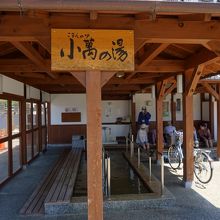 小萬の湯は、関宿の地蔵院辺りから少し坂を登ったところ。駐車場に隣接した足湯施設です。この日も、地元の人でしょうか。何人もの人が湯につかっていて、おしゃべりをしていました。少し濁った湯はちょうどいい加減の温かさ。塩分も含んでいるようです。