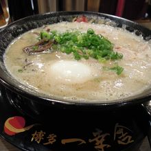 出てきたラーメンは泡だったスープのとんこつラーメン、博多らしいとんこつの濃厚な香りに満足です。