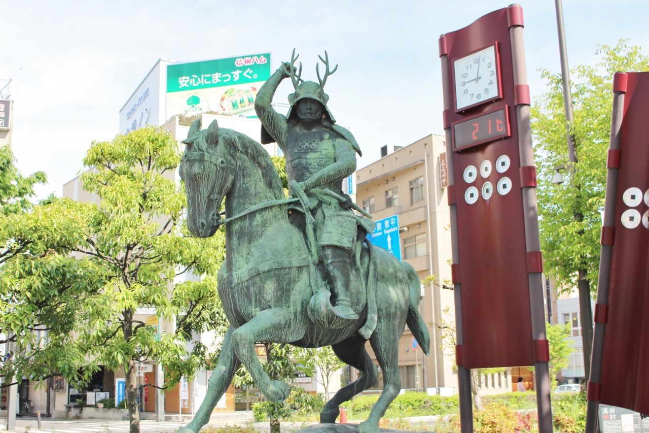 真田駅前になる真田幸村の銅像です。彼の銅像は色々ありますが、一番私のイメージ通りの銅像になっています。表情などはよく解りませんが、六文銭の旗をバックに、鹿角の兜を被った勇ましい姿で、上田市民や観光客を見守っているようでした。