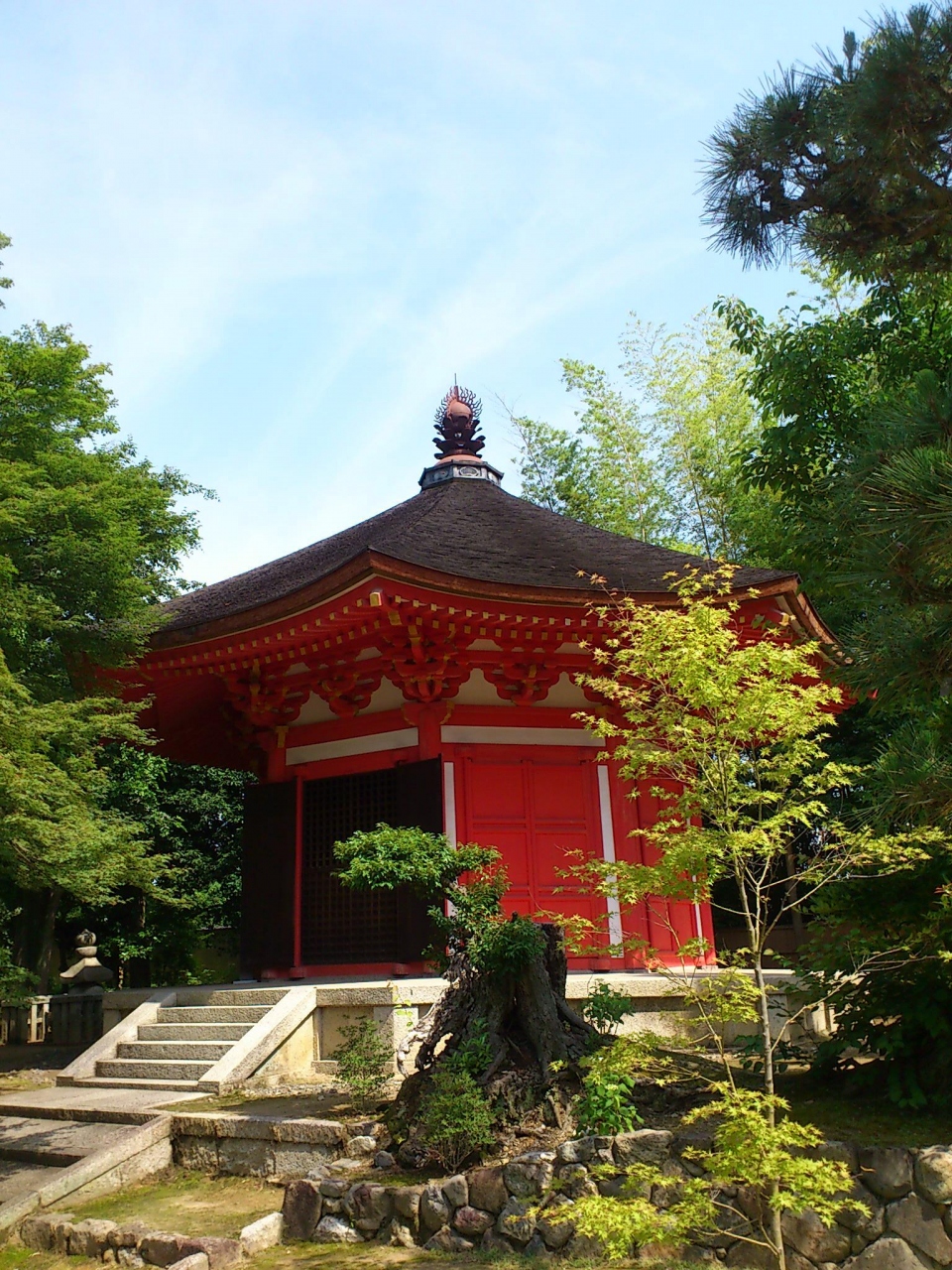 東福寺の通天橋を渡りきったところに建つお堂です。6月の新緑の青紅葉の中に朱塗りの柿葺の八角円堂がとても目立ちます。名前の通り愛染明王が祀られています。もともとは万寿寺にありましたが、室戸台風で倒壊してしまったものを、ここに移して修築されたものです。