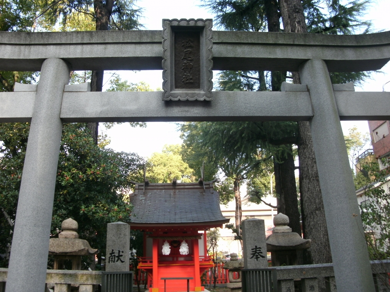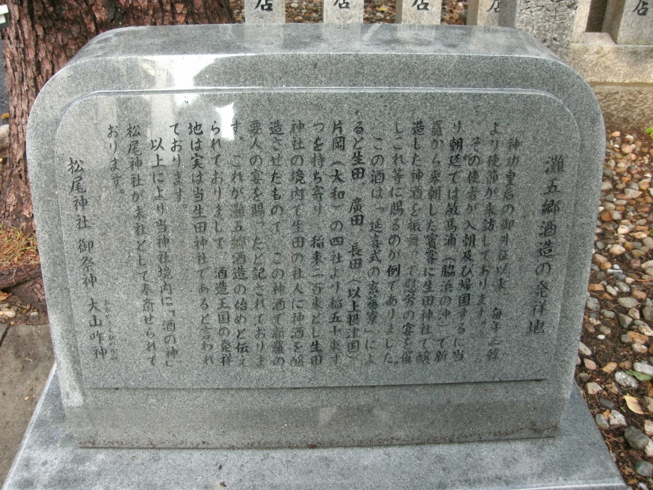 その昔、生田神社で醸造した神酒で新羅からの使節をもてなし、これが灘五郷(神戸市灘区・東灘区・西宮市にまたがる地域)における酒造りの始めとなったと伝えられていていることから、酒の神として信仰されている松尾神社を境内末社として祀り、灘五郷酒造の発祥碑が建てられたものです。
