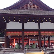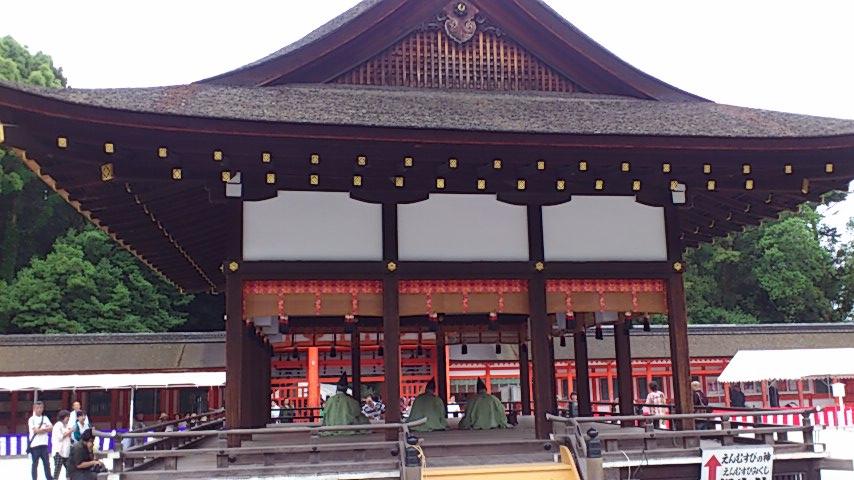 出来町柳駅から徒歩で下鴨神社へ参詣しました。糺ノ森に沿った参道を進み、とても鮮やかな朱色の楼門をくぐって境内に入ると目の前にこの舞殿があります。本殿の前の境内にどんと建っています。加茂祭の時に勅使が御祭文を奏上する場所です。これも国の重要文化財に指定されています。