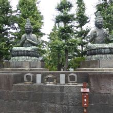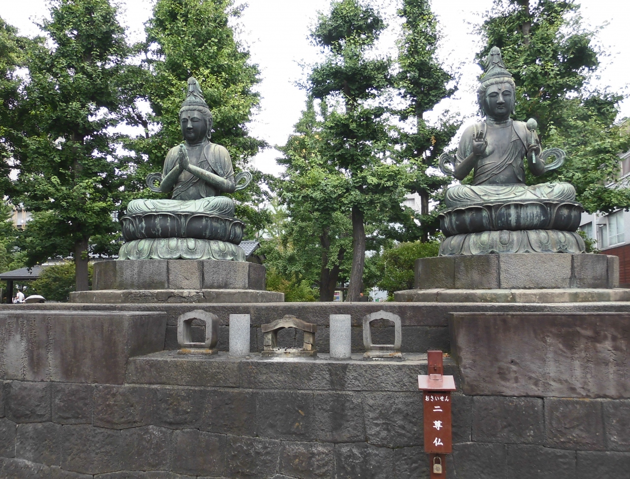 宝蔵門の右側の一画に、露座の二体の仏像が鎮座している。右に観音、左に勢至の金剛坐像で蓮台を含めて4.5mの像高を誇る。貞享4年(1687)群馬館林の豪商、高瀬善兵衛なる人物が、主家への報恩と菩提を弔うために造立したもの。豪商と云えば、色街で湯水の如く散財するのがイメージできるなか、高瀬善兵衛は立派な人物であったのでしょうな。