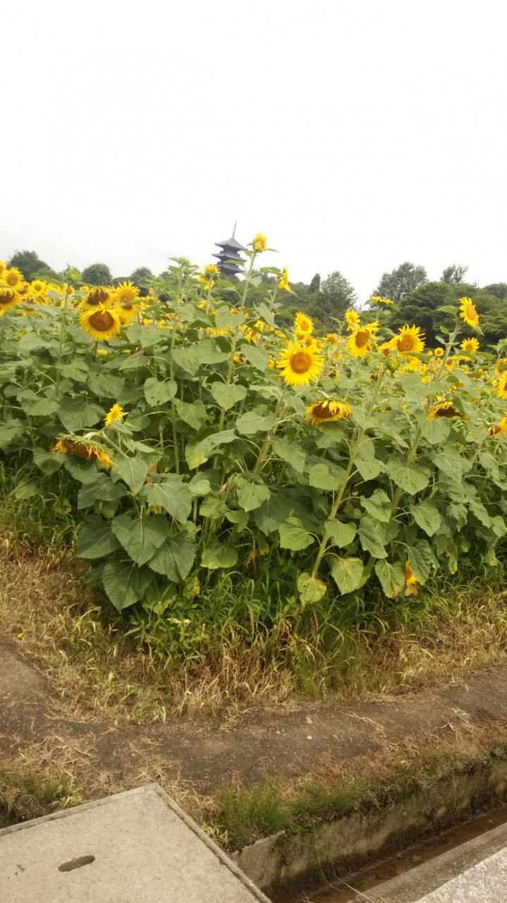 またこの時期は、五重塔より手前の田んぼの一部にひまわりが咲いています。