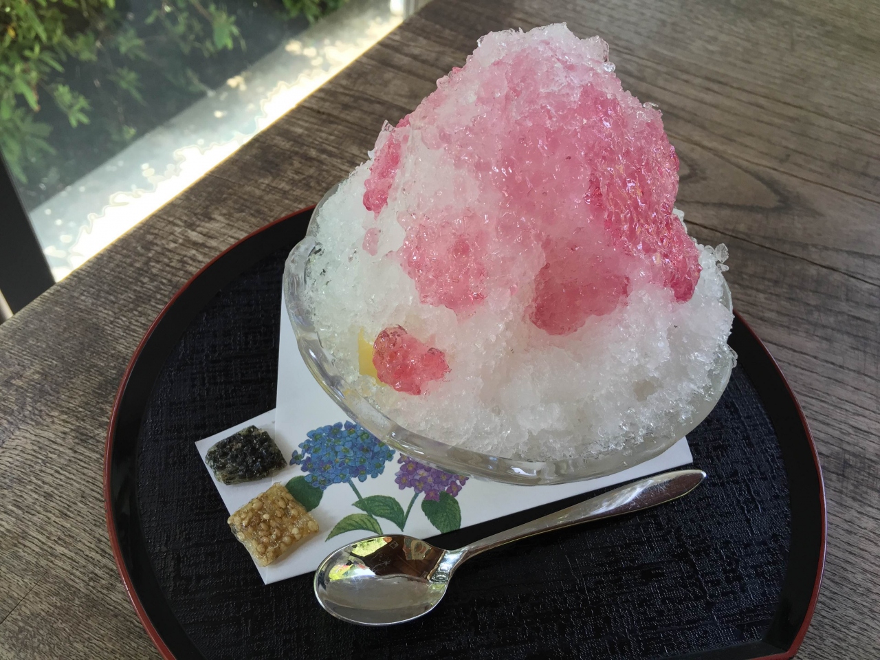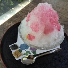 暑かったのでちょっと休憩しようと、中のお茶屋さんでカキ氷を頂きました。あじさい氷という涼しげな見た目のかき氷で、ぶどう味のゼリーがトッピングされていて、中はフルーツが入っていました。宇治金時やいちごミルクなどの定番もあります。
