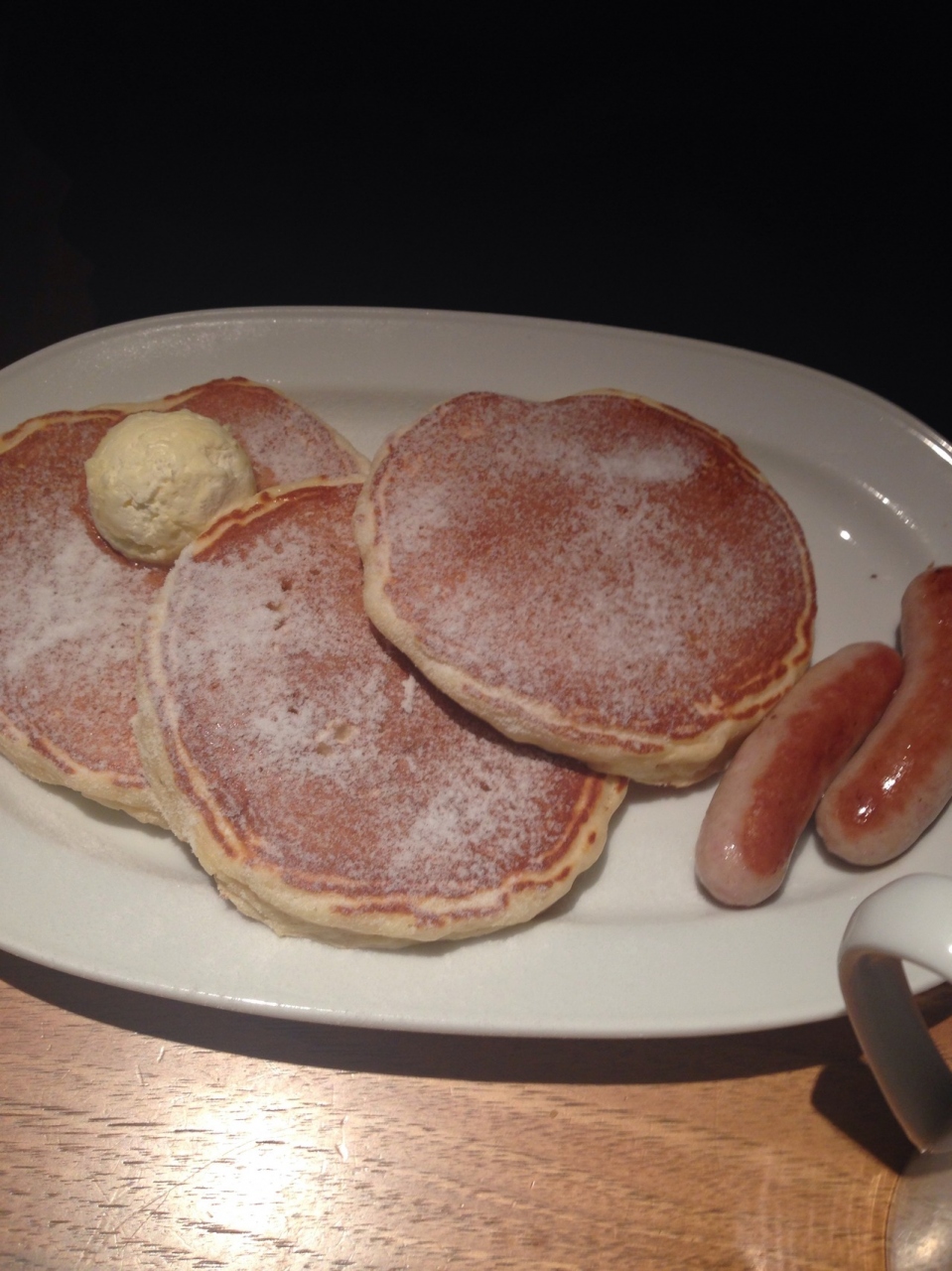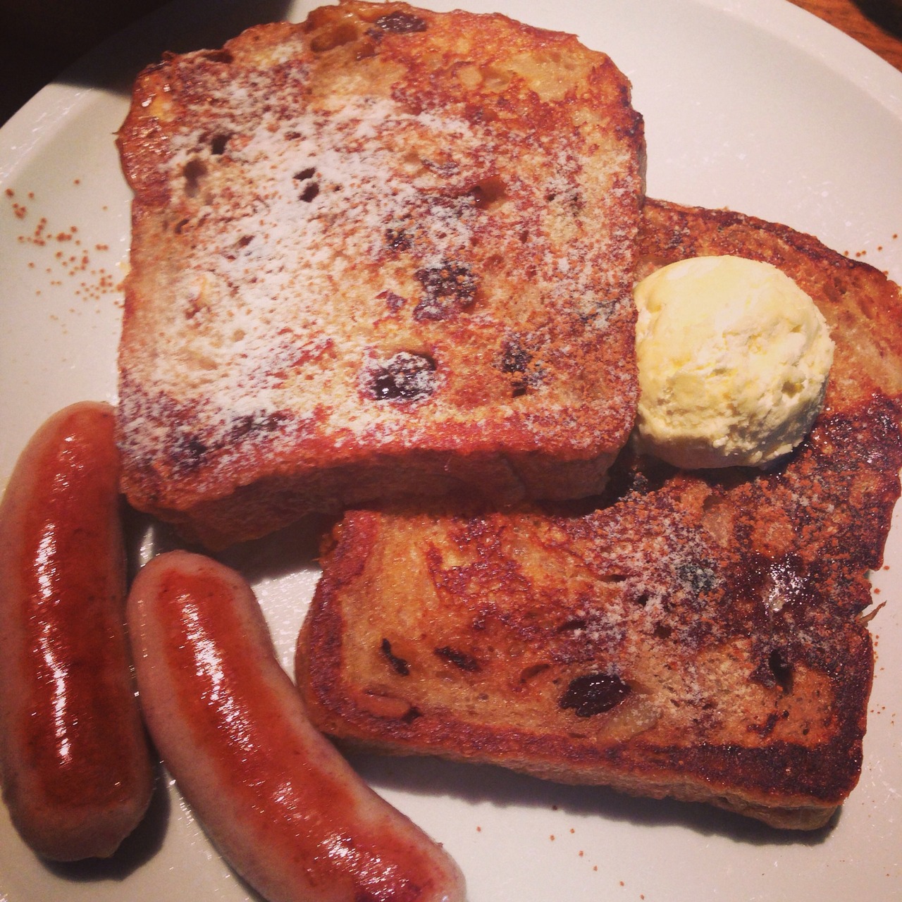 私はフレンチトースト、彼はミルクパンケーキをチョイス。二人ともアメリカンブレックファースト風にハーブソーセージを付けて。