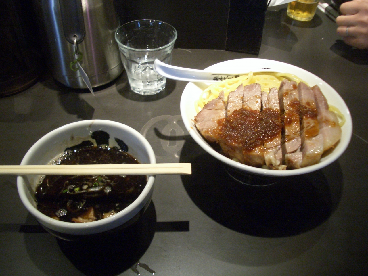入り口に近い、人が後ろに並べない席に案内されました。やったー。旦那さんは大きなチャーシューが載ってるつけ麺。つけ麺がメインの店でしたが、私はあまり好まないのでラーメンを注文。
