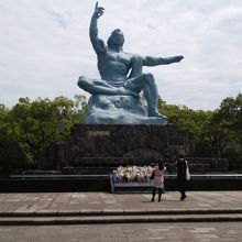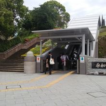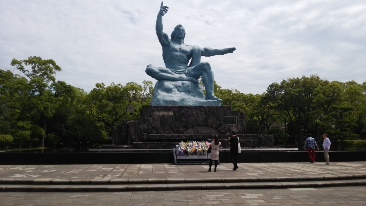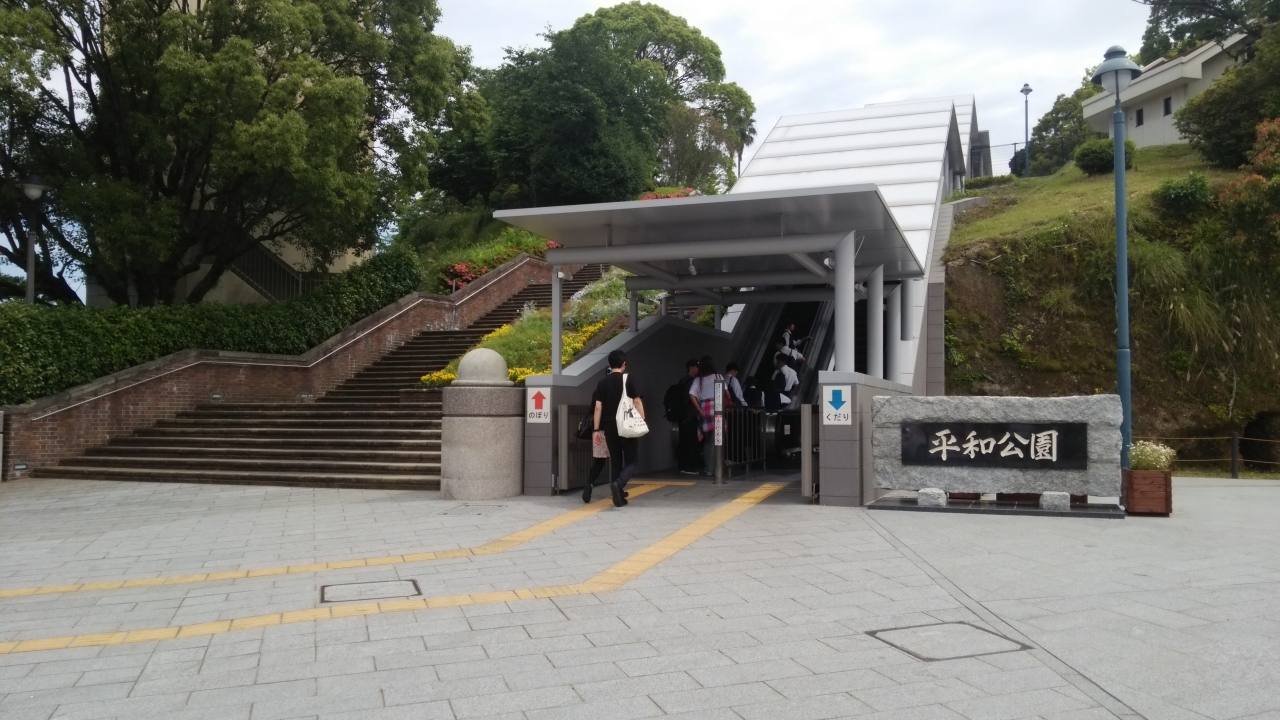 長崎観光の一つの中心とも言える平和公園。市電の松山町の電停から歩いてすぐ。信号を渡ったら、そこからエスカレーターで公園まで一気に上がることができます。シンボルになっている平和祈念像は一番奥にありますが、そこに行くまでにさまざまな見どころがあります。ゆっくり時間を取って回りたいスポットです。