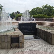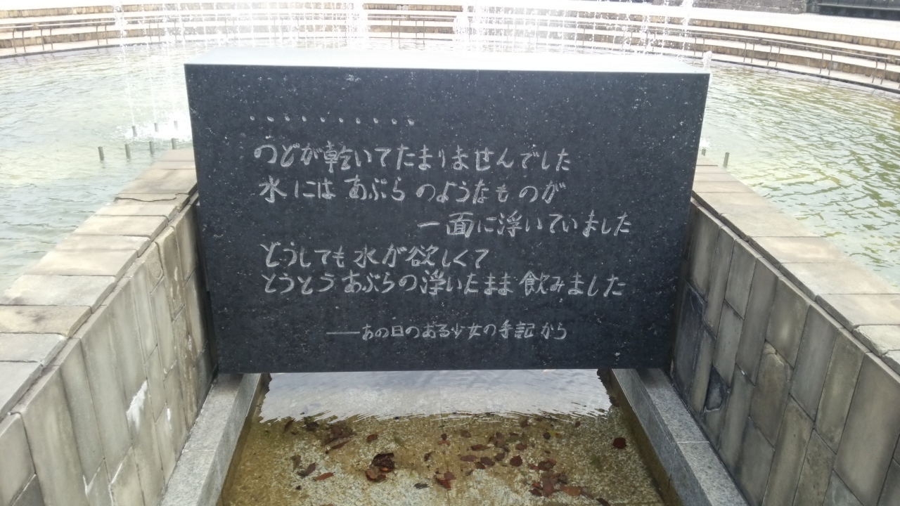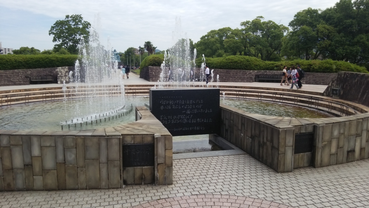 松山町電停から、エスカレータで平和公園に入ったすぐのところにある噴水のついた泉。原爆投下当時に水を求めてさまよった人々が、油の浮いた水を口にしたと碑文に書いてあって、それを読むだけでも胸が締め付けられます。奥には祈念像が見える場所です。