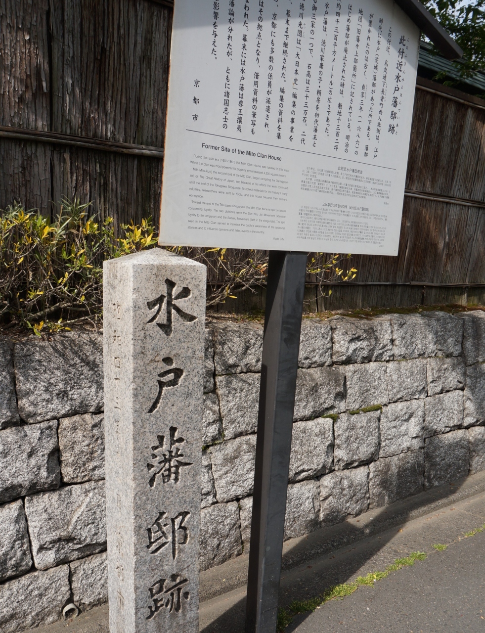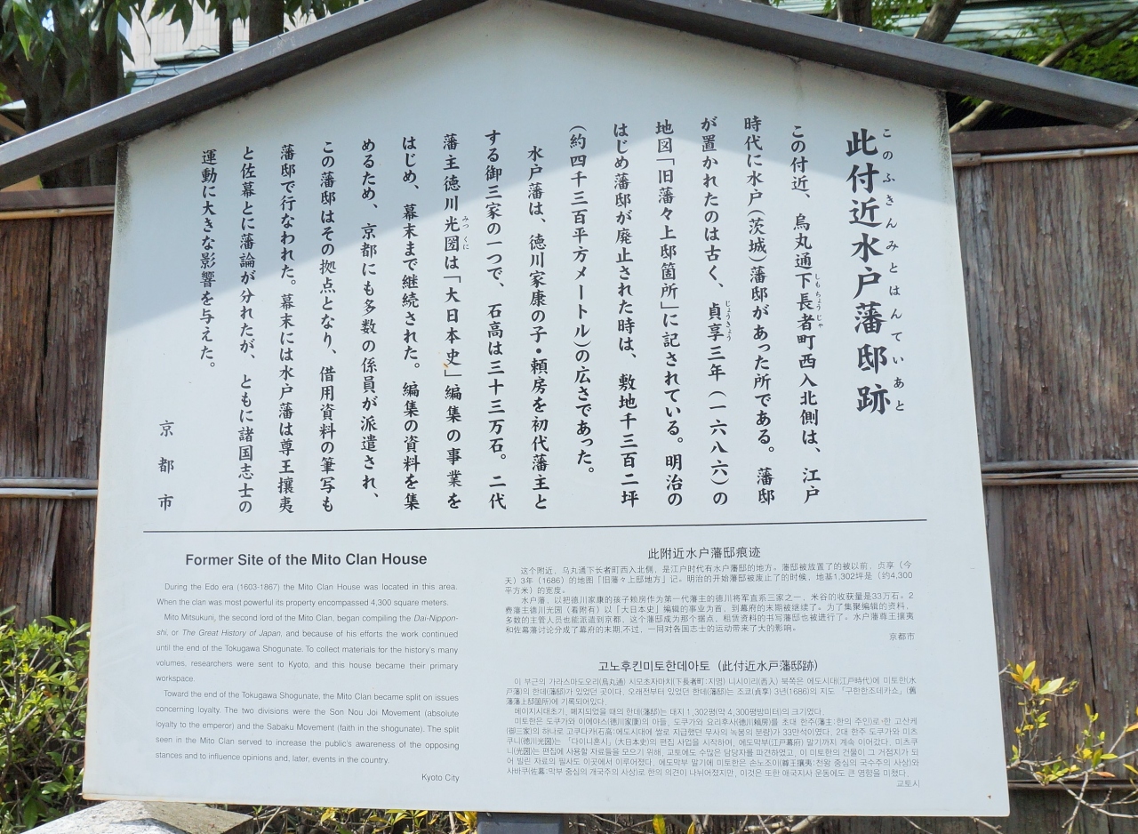 京都御苑の西側烏丸通を歩いていると、水戸藩邸跡の石碑がありました。
