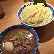 こちらの、つけ麺はトロみのある濃厚なつけ汁と、つるつるした麺のバランスが最高で、食べている途中にすだちを絞ると、味が締まり、また違った味になります。