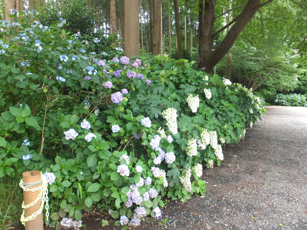 梅雨時は旅行の計画が立てにくい。こういう季節は、近場で晴れた日を選んでのウォーキングが一番。水戸の中心街近くにも、いいウォーキングコースがあります。まずはここ、水戸八幡宮。さまざまなあじさいがあり、「あじさいの小道」に入り込むのも楽しい。そのあとは、洋画家・中村つねの墓、詩人・山村暮鳥の墓を訪ね、保和苑まで。保和苑は「水戸のあじさい寺」と呼びたいほどあじさいがたくさん咲いている寺です。
