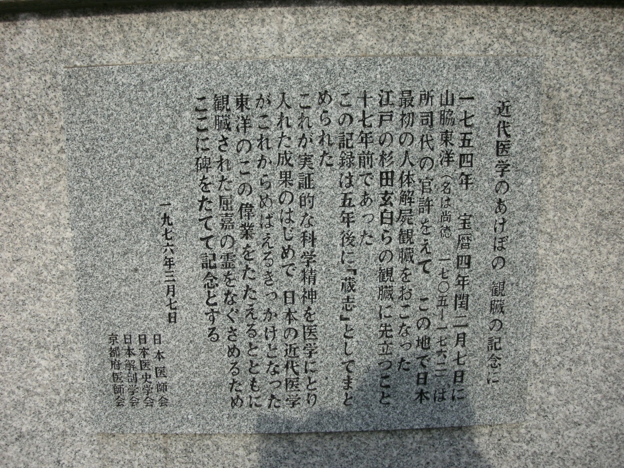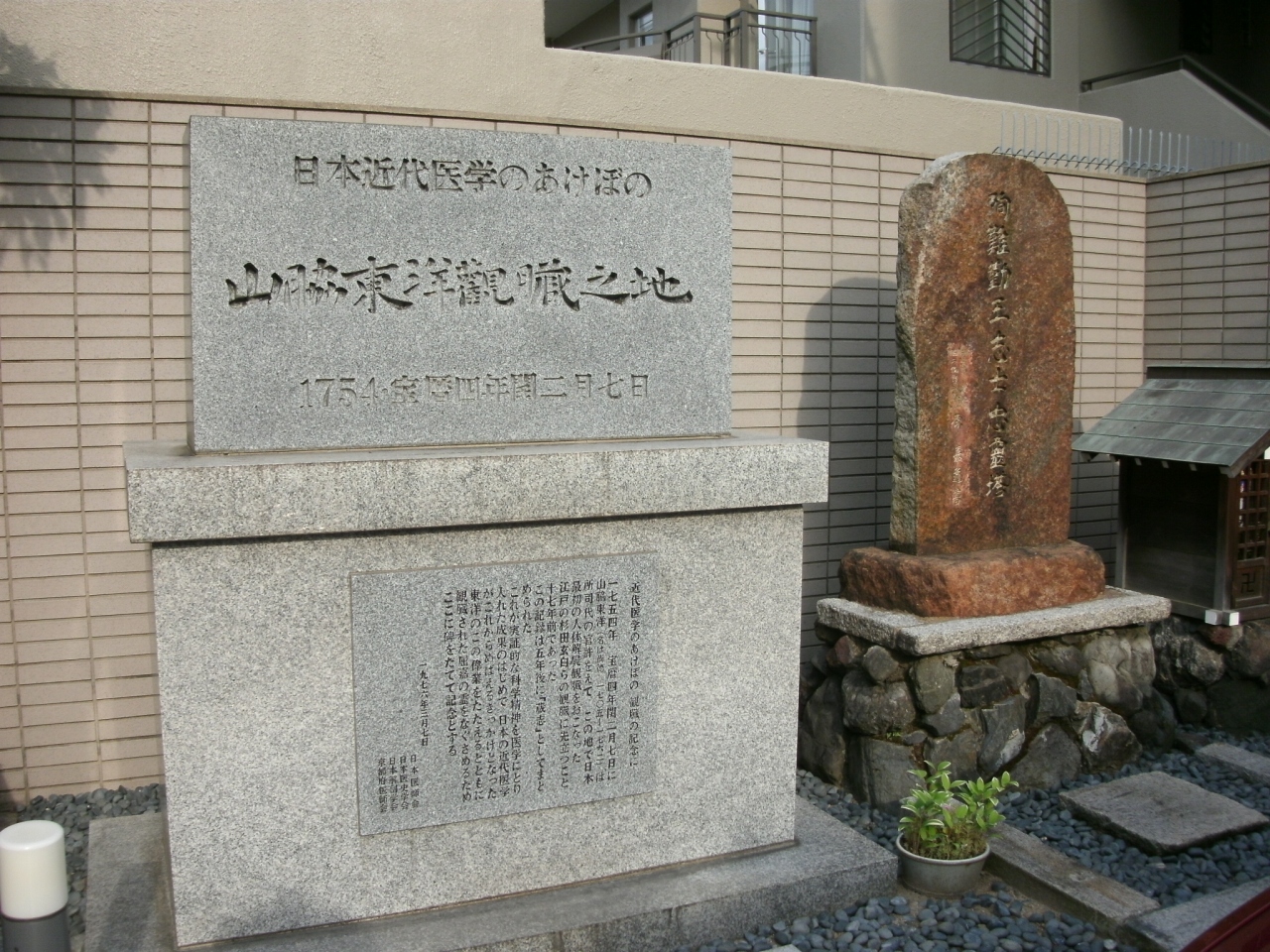 また、ここは宝永4年(1707年)年に、医師・山脇東洋によって死刑囚を使った日本初の遺体解剖が行われたところで、石碑には東洋の行った解剖の意義などが記されています。
