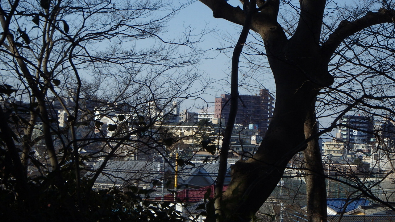 頂上付近から西方向を眺めたところ、ビルの間から白い山が見えていましたが、富士山かどうかは未確認。関連サイトの中には、ここからは今は富士山は見えないという記述もあります。