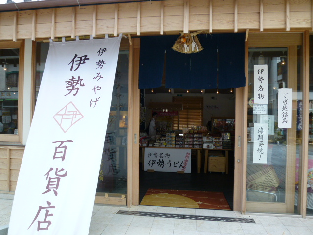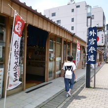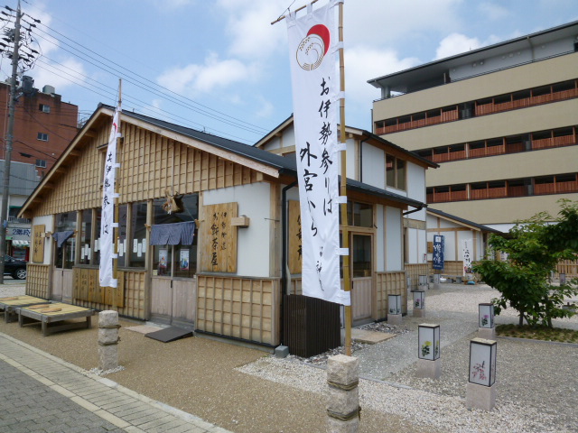 今日は伊勢市の観光です。伊勢市駅から外宮まで、この「外宮参道」を通って外宮へいきます。参道の両脇には様々な店舗がならんでいます。海産物販売の鈴木水産、練り物の若松屋、そして有名な赤福、楽しんでんくださいね。道幅は広く外宮からの一方通行です、車がきますので歩行には注意くださいね。