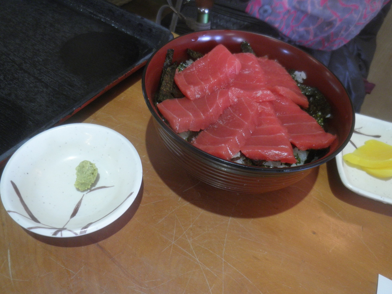 札幌から小樽までドライブしたとき、時間があったので余市まで足をのばして、有名な柿崎商店の2階でランチをいただきました。 今回はマグロ丼でででーんとマグロの赤身をのせた食べ甲斐のあるどんぶりです。 平日だったし、お昼をはずしていったんでほぼ並ばないで食事ができました。 お茶やお水はセルフサービスでした。