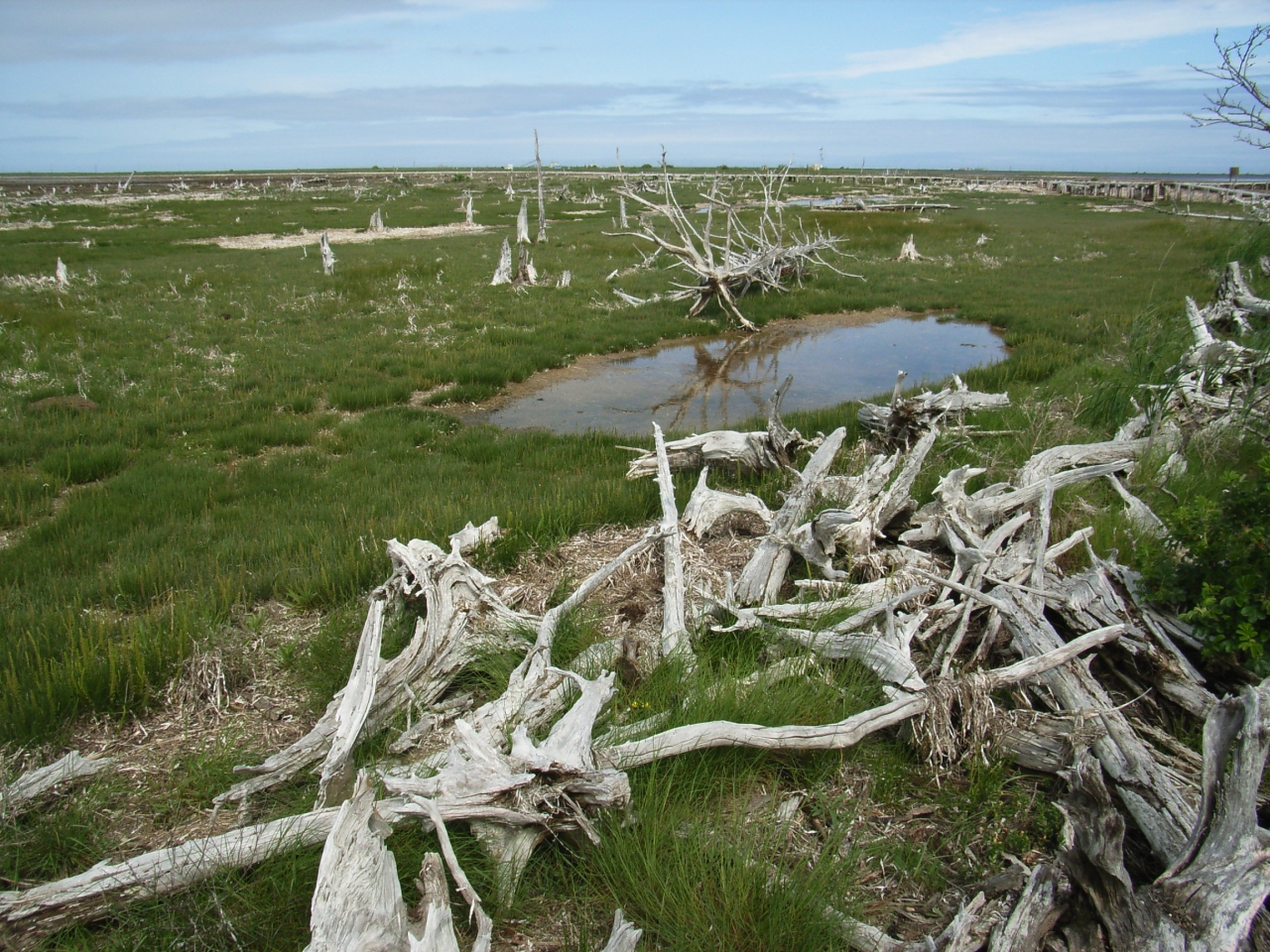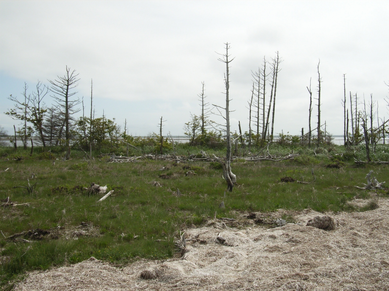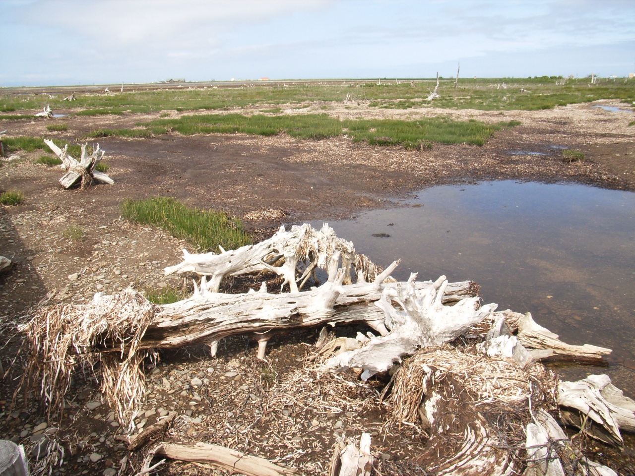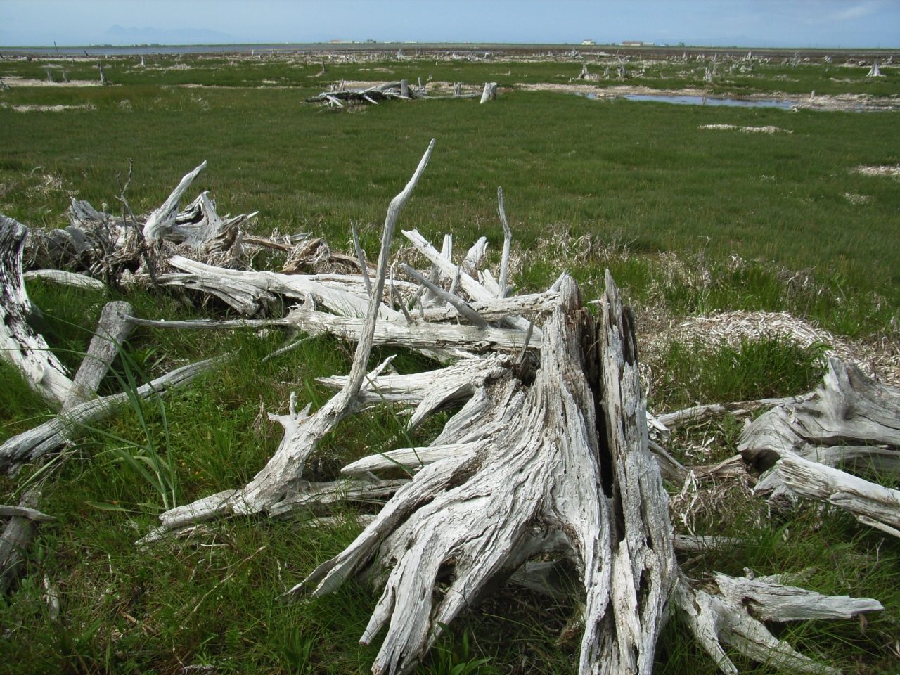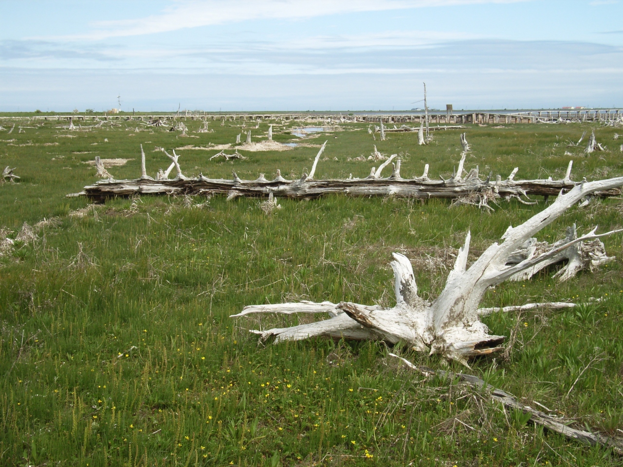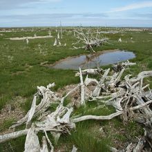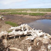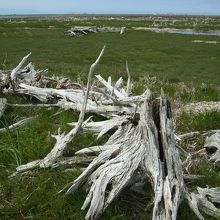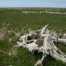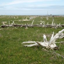 野付半島には海水の塩分や潮風によって枯れかけたトドマツの木々を見ることができます。野付半島ネイチャーセンターから草原を30分ほど歩いたところでトドワラという風景に出会えます。木道の両側に枯れかけたトドマツの木々があります。ネイチャーセンターの方の話では、あと十数年したらトドワラも見られなくなり草原になってしまいますよとの話でした。自然の脅威と言ったところでしょうか。