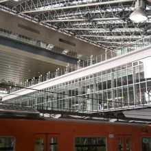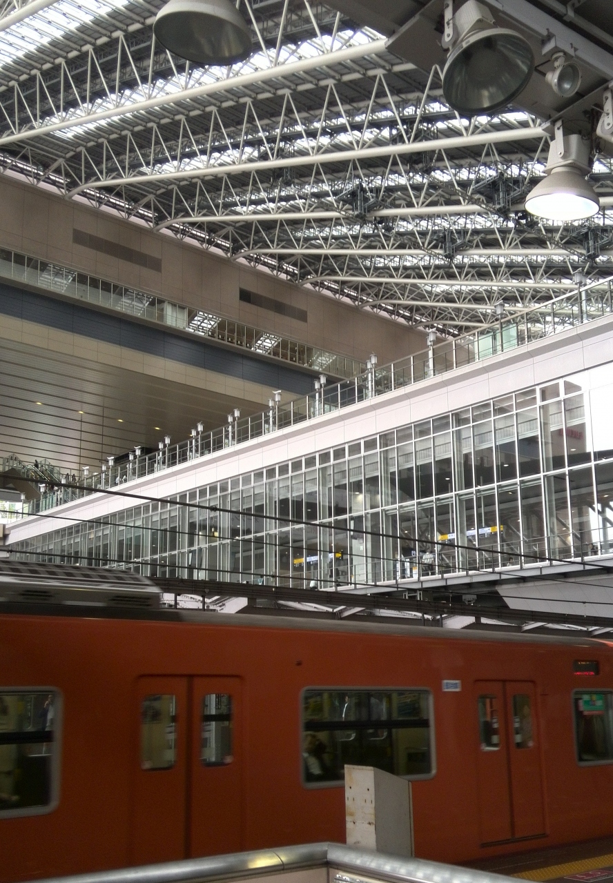 大阪の玄関口です。平日の午前中の撮影ですが人の流れが絶えません。大阪環状線の外回り電車が発車するところです。大きな屋根が写っていますがなんとなく外国にきたような異国情緒を感じる屋根です。西側の建物から高みの見物をしてみたいですね。