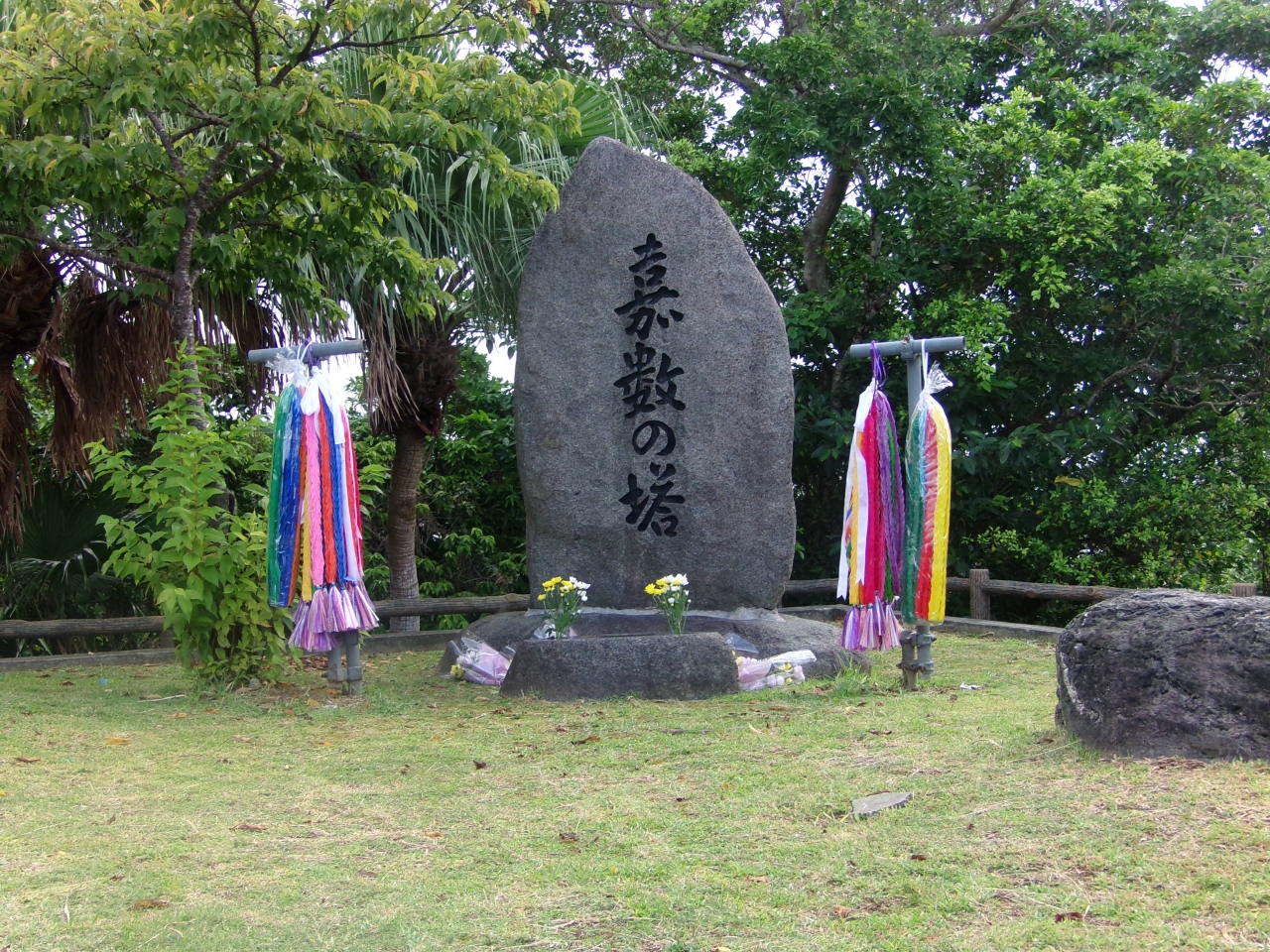 同一敷地内にある?京都の塔?は、沖縄戦に於いて数少ない?沖縄の住人?の被害について触れているものであります。都道府県別慰霊塔をこの嘉数の地に建設した後、この?嘉数の戦没者?を慰霊するため、昭和50(1975)年6月に沖縄京都の塔奉賛会の手によって建立されたものが?嘉数の塔?になります。合祀数は376名で、うち沖縄戦没者343名・他地区戦没者33名となっています。管理をされているのが地元?嘉数自治会?ということもあり、京都の塔共々慰霊の?献花?と?千羽鶴?が絶えません。