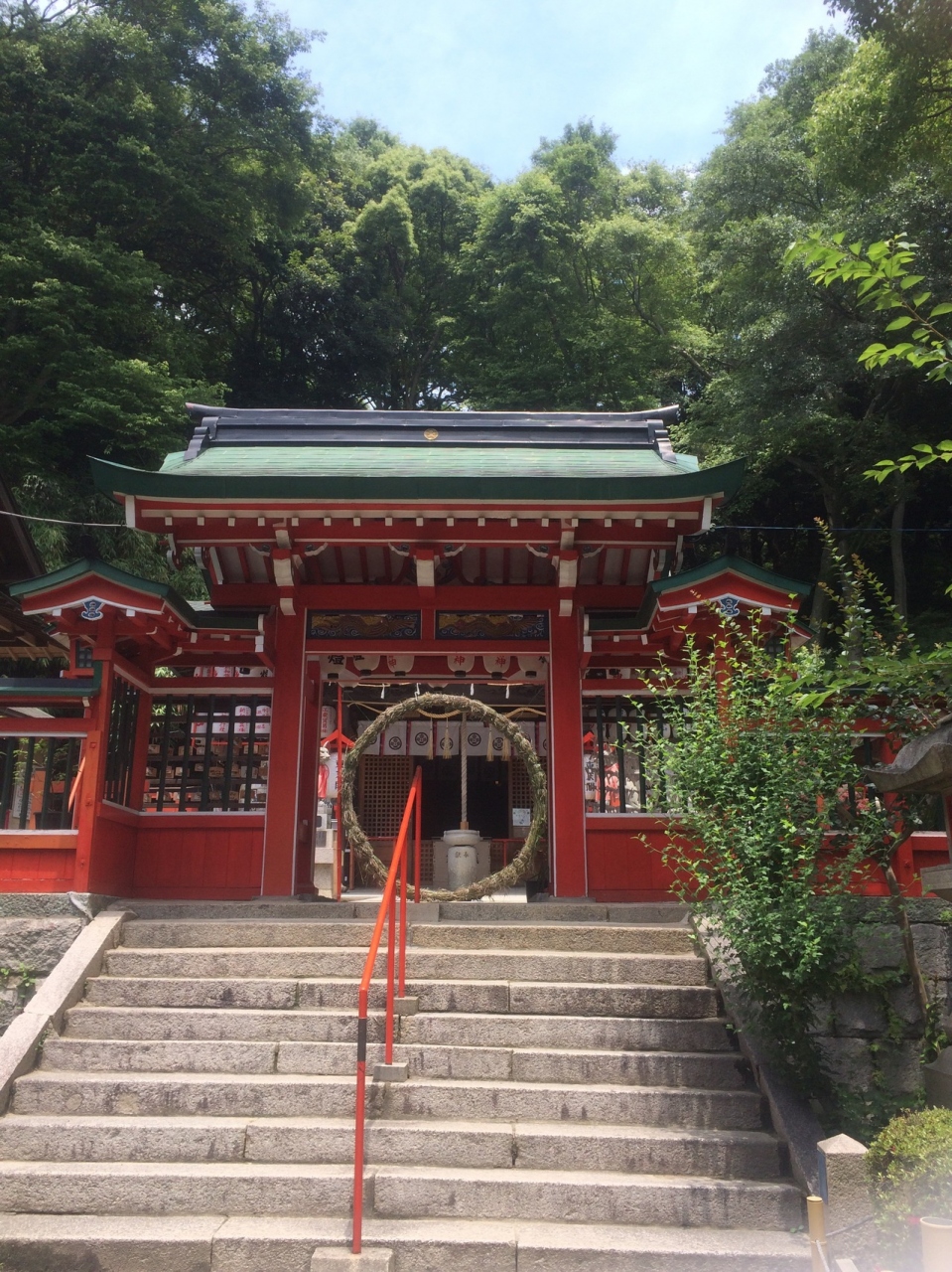 諏訪山にある神社、諏訪神社。坂を登る階段を上がり…そんな高い位置にあります。丘の上には朱赤の杜があります。ネコもお昼寝中ののどかな雰囲気。境内には稲荷神社もあります。そこからヴィーナスブリッジに登れます。