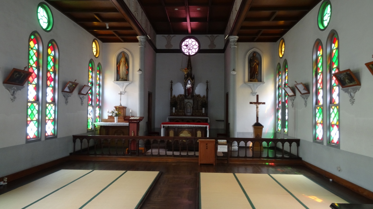 外観は西洋ゴシック風の石造りの建物ですが、中に入ると珍しい畳敷きの聖堂となっています。津和野っぽいですね。また、ステンドグラスが眩しいです。