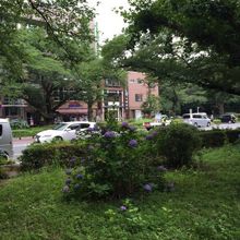 6月の梅雨時は紫陽花で、桜の木の下にびっしりと植えられています。
