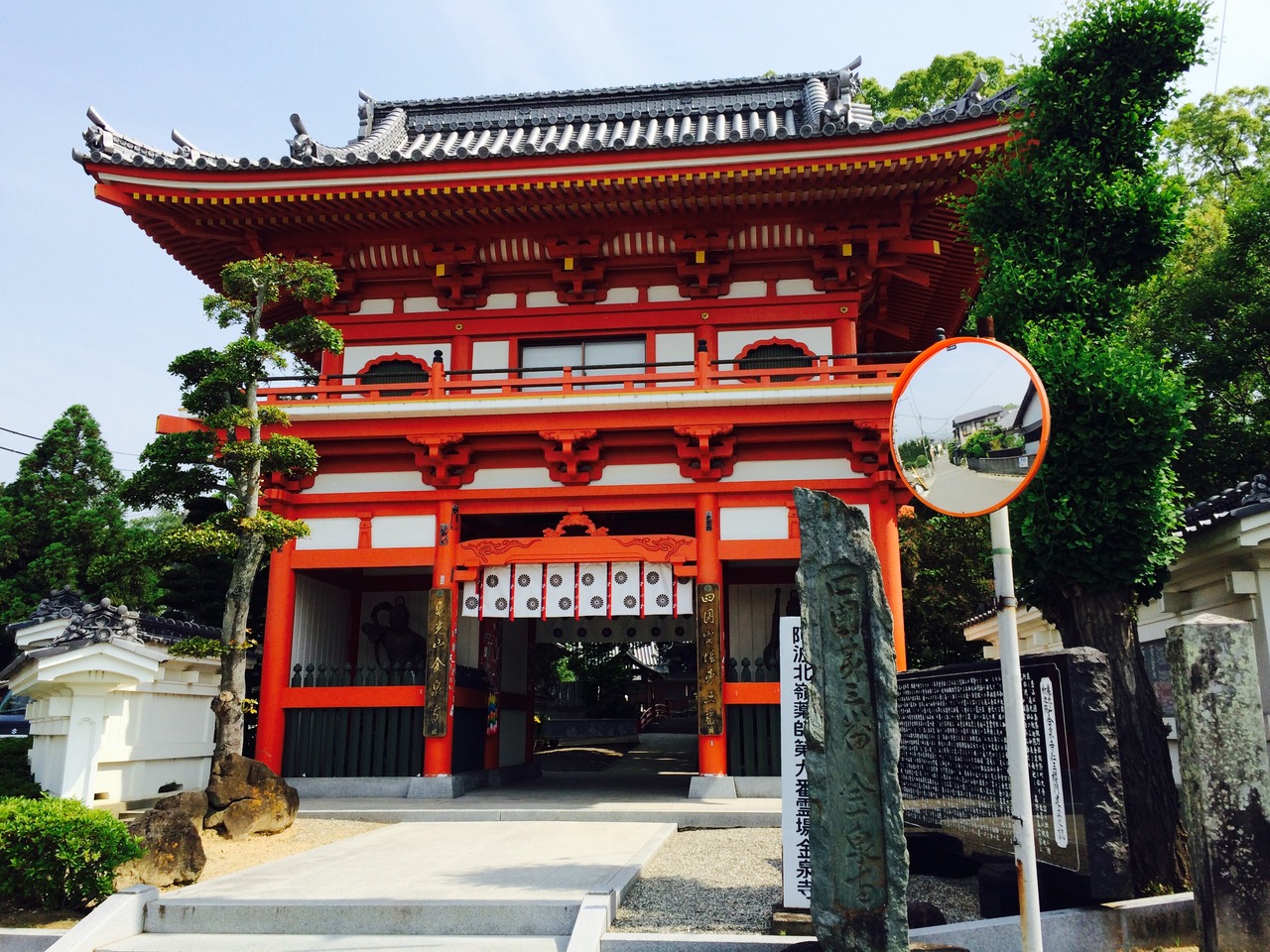 二番札所極楽寺から歩いて来たので門から入らず裏から入りました。境内は小さいですがコンパクトにまとまっていて、これぞ寺と言った感じです。トイレは昔ながらの古いトイレでした。正面の赤い門は立派なたたずまいで石碑も建っています。