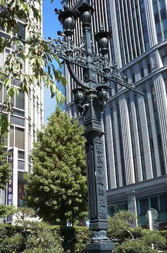(黒いお洒落な街灯のような柱があり、「東京市道路元標」と刻まれています。通常の元標は石柱ですが、ここは例外で市電の電柱や電灯も兼ねていたとのこと)