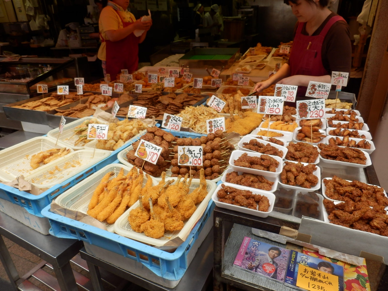 ひろめ市場から歩いてすぐ、1本南側の通りにあるお店です。店先に厚揚げやフライ、唐揚げ等がずらりと並んでいて惹かれました。店先にはテーブルと椅子も用意されているので、座って食べられます。さらに嬉しいことに、目の前は酒屋さんで、ビールも調達出来ました。